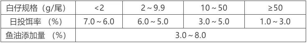 ? 根據(jù)存池白仔的規(guī)格及數(shù)量、氣候、水溫、水質(zhì)、白仔的生長及攝食狀況等因素進行適當?shù)卣{(diào)整。