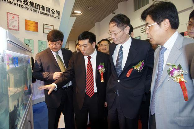 陳慶堂(左二)向農(nóng)業(yè)部高鴻賓副部長(zhǎng)介紹水產(chǎn)品及天馬的相關(guān)配合飼料